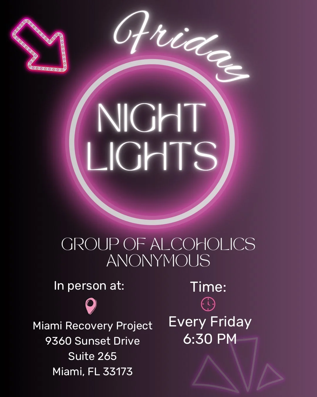 AA Meeting - Friday Night Lights Friday, April 17, 2026 6:30 PM 7:30 PM Miami Recovery Project 9360 Sunset Drive #265 Miami, FL, 33173 United States (map) Google Calendar ICS